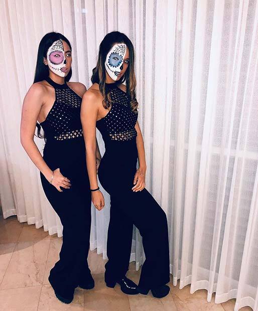 Next, we have another matching costume idea. These two friends are wearing matching outfits and sugar skull makeup. The only difference is that one sugar skull design has a pop of pink and the other blue. This is another easy to wear and create costume. Recreate this sugar skull makeup or choose your own. You can find sugar skull makeup tutorials online.