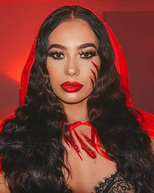 This next costume is a creative twist on Red Riding Hood. She wears the classic red cape, complemented by stunning makeup. The Halloween twist comes with red, bloody claw marks from the wolf, adding a spooky edge. This costume perfectly balances cute and creepy, giving you the best of both worlds for a memorable Halloween look.