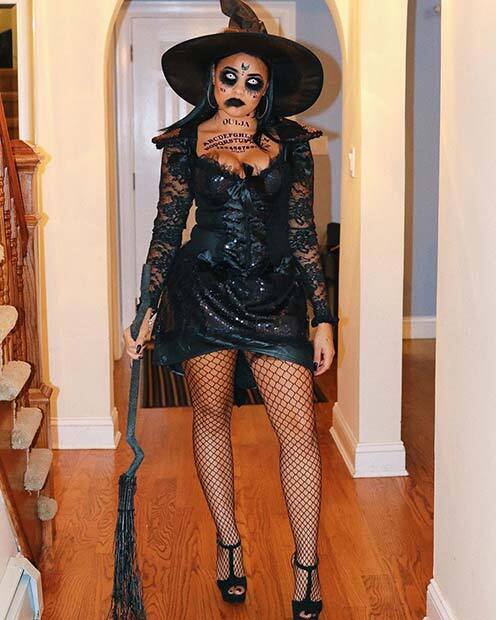 A witch is a Halloween classic, but this version takes a darker turn. The costume features a black dress and hat, complemented by eerie makeup and a Ouija board design on the chest. It’s ideal for those who enjoy a good scare and want to make a chilling impression this Halloween!