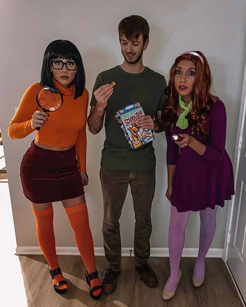 One of our favorites is this Scooby Gang costume! Here, friends are dressed as Velma, Daphne, and Shaggy. If you have a larger group, you can also include Fred to complete the team. This fun and nostalgic idea is perfect for fans of the show and movies. You can either buy complete costumes online or go the DIY route for a personalized touch.