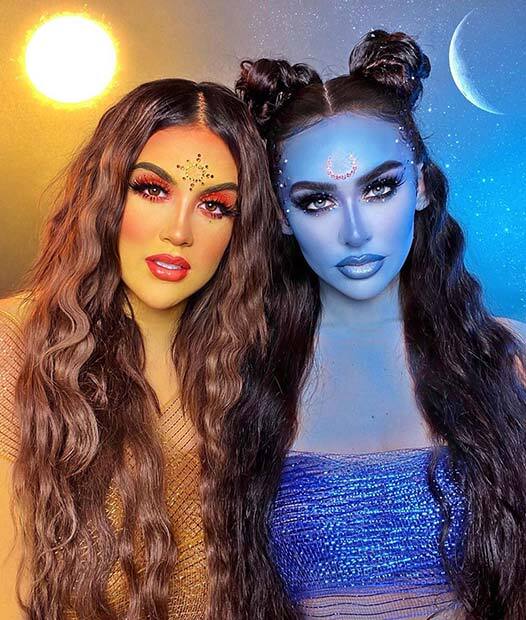 If you’re after a unique costume idea, consider dressing as a sun or moon goddess. One costume features bright orange and red tones with a rhinestone sun, while the other uses cool blue makeup with a rhinestone moon. This bold and spiritual look is both striking and elegant, ensuring you’ll stand out from the usual spooky crowd.