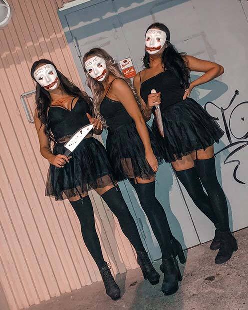 Another popular costume idea is inspired by the movie The Purge. For an easy-to-create version, each person can wear a black top and skirt with boots, paired with a mask from the movie. This look is perfect for both solo wearers and groups. You can easily find Purge masks online to complete the ensemble.