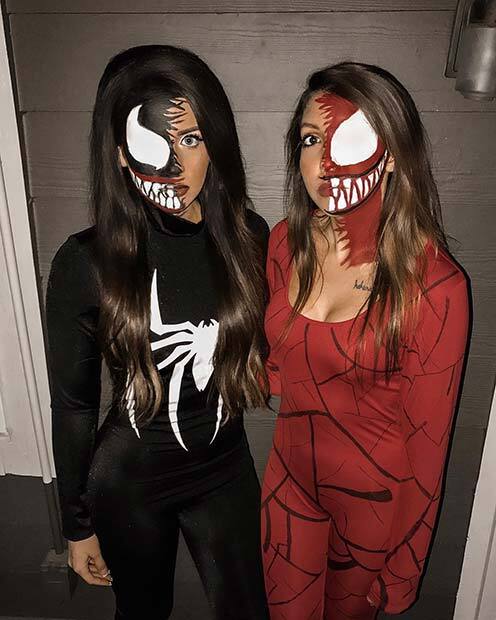 If you’re a fan of the movie Venom, this costume idea is for you. These two are dressed as Venom in different colors, offering a unique twist on the character. It’s a fun and standout option for franchise enthusiasts. You can find Venom costumes online, and if you prefer, one person can go as black Venom while the other dresses up as Eddie Brock for a complete duo look.