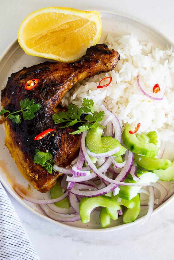 Infused with a lively mix of yogurt, aromatic spices, and fresh herbs, this spatchcocked Whole Roasted Tandoori Chicken is a show-stopping centerpiece for any dinner party. Roasted and broiled to achieve a crispy, charred finish that captures the essence of tandoor cooking, it’s bursting with bold flavors. Pair it with cooling Cucumber Mint Raita and fragrant Saffron Rice for an unforgettable main course.
