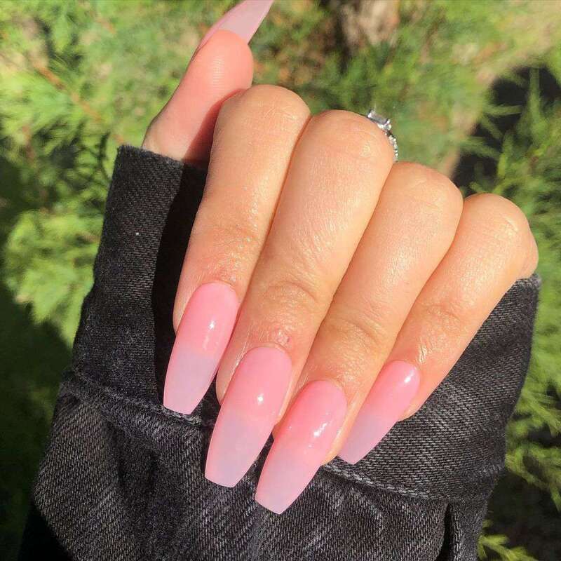 This trend is currently one of the most elegant, versatile, and flattering manicures you can wear. It features a natural pink shade with a vinyl effect shine that resembles lip gloss.