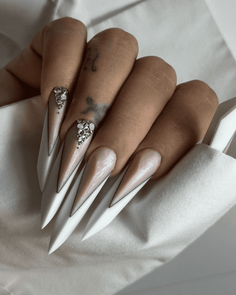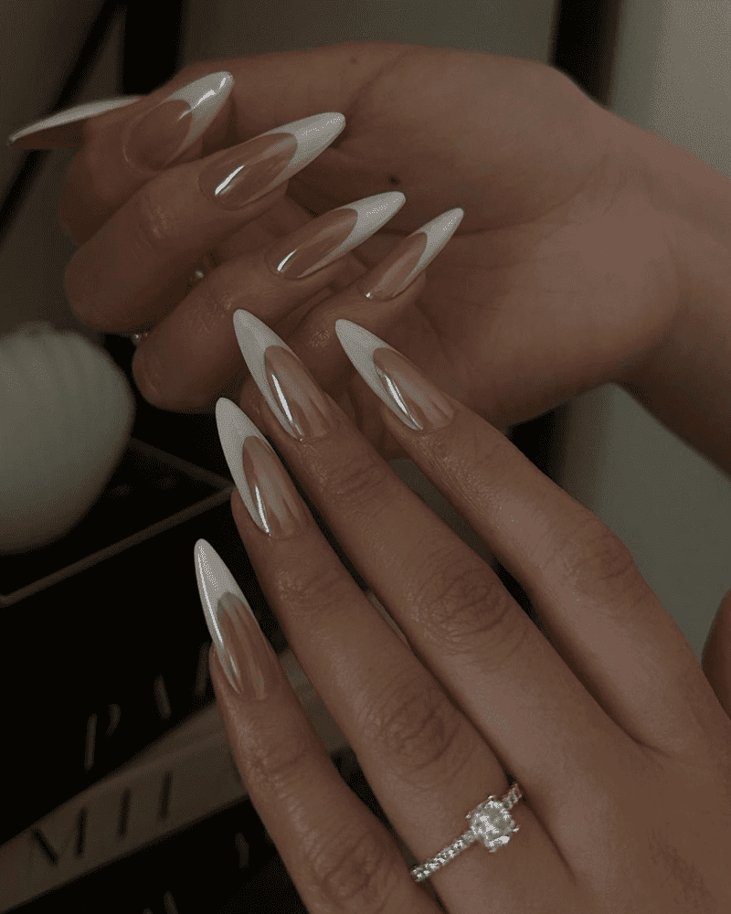 French nails are reinvented each season with fresh variations, like this innovative design that blends traditional and pointed styles with a metallic touch.
