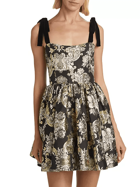 This floral jacquard corset mini dress by Self-Portrait epitomizes spring and summer elegance. Its delicate floral print evokes a sense of romance, ideal for warm-weather occasions. The structured corset top not only accentuates the figure but also adds a touch of sophistication to the ensemble. Crafted with meticulous attention to detail, this dress exudes femininity and charm. Pair it with strappy sandals and a clutch for a chic and polished look perfect for garden parties or outdoor events.