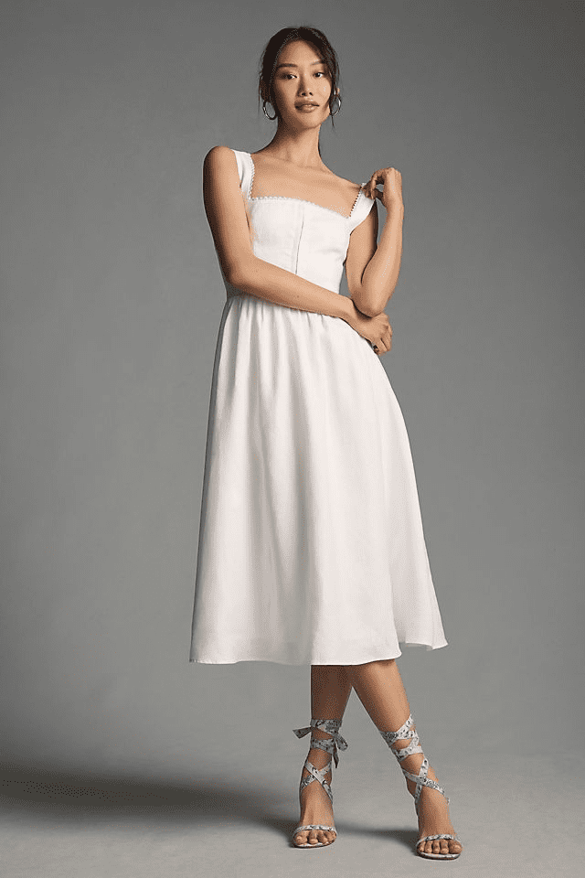 This white linen corset mini dress by Zimmermann is a chic and elegant option for a summer day. The lightweight linen fabric is perfect for warm weather, and the corset top adds a touch of structure. The fitted bodice effortlessly transitions into a flowy mini skirt, creating a balanced blend of sophistication and playfulness. Zimmermann’s signature touch is evident in the subtle details, like delicate buttons or intricate stitching on the corset, which elevate the dress beyond a basic silhouette. This white linen corset mini dress is perfect for a summer brunch, garden party, or even a day of shopping, ensuring you look polished and effortlessly stylish throughout the warm day.