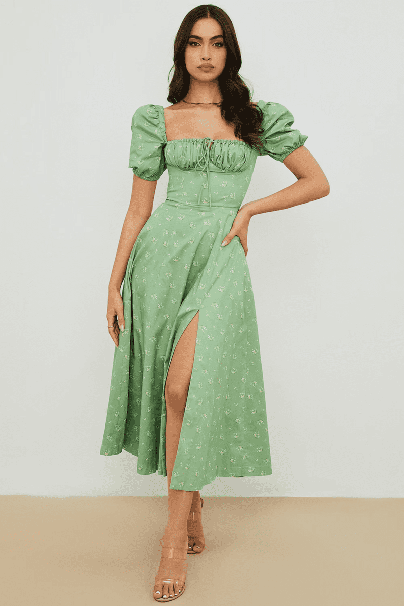 House of CB’s Tallulah Floral Puff Sleeve Midi Dress in olive is the epitome of summer garden chic. The dress is crafted from a crisp, cool stretch cotton poplin that drapes beautifully and ensures a comfortable fit throughout the day. Its defining feature is the gorgeous olive green floral print, a delicate pattern that adds a touch of whimsy without overwhelming the look. The silhouette itself is both flattering and romantic. Puff sleeves, a signature detail of the Tallulah dress, add a touch of vintage flair and balance the proportions of the fitted bodice. The bodice cinches the waist, creating a beautiful hourglass shape, and may even feature corsetry boning for added structure and support. The skirt flows into a midi length, perfect for showing off your favorite sandals or heels. This dress is perfect for a summer wedding, a garden party, or a special brunch – anywhere you want to look effortlessly elegant and feminine.