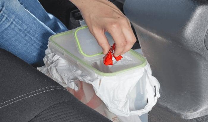 Head to your kitchen or the nearest dollar store and grab a plastic cereal container. Line it with a plastic bag, then place it inside your car. This simple, improvised trash can gives you a convenient spot to dispose of trash, helping you keep your car clean and organized on the go!
