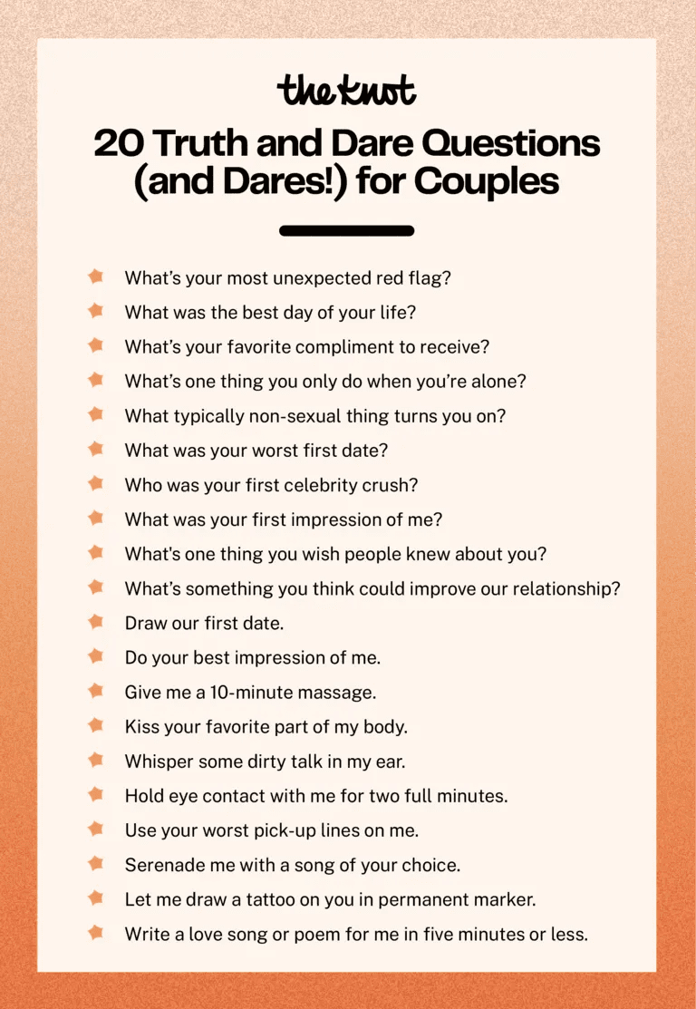 Ready to dive in? The truth or dare questions for couples below range from light-hearted and funny to deep and even a bit steamy. Just remember, as always, enthusiastic consent and mutual respect are essential.