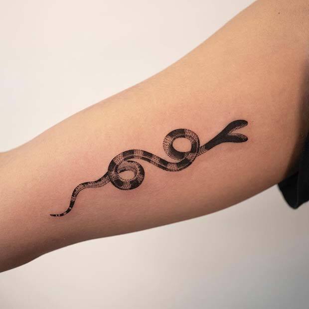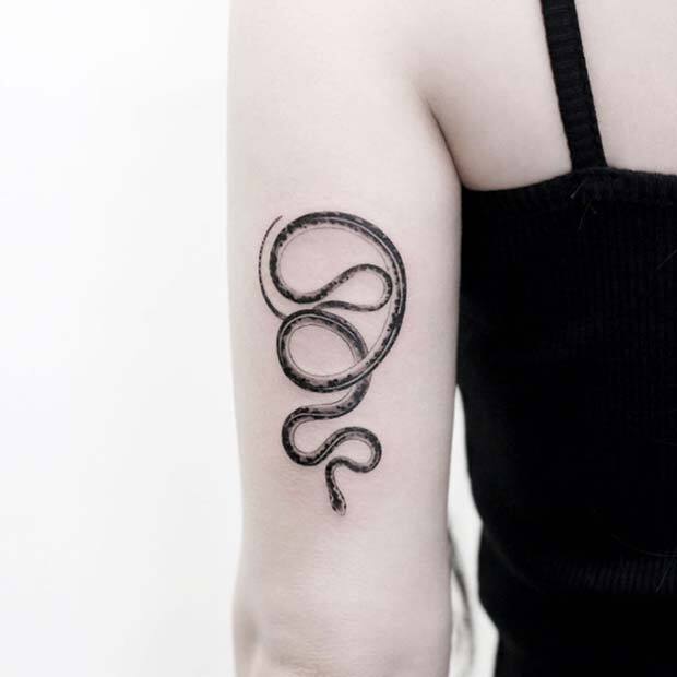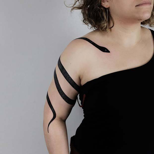 This design showcases a simple black ink snake that appears to wrap around the arm. It’s a bold tattoo that makes a strong statement. You can recreate this design, or a similar one would look great on the leg as well. If you want to add some color, you can also choose any snake pattern to enhance the tattoo.