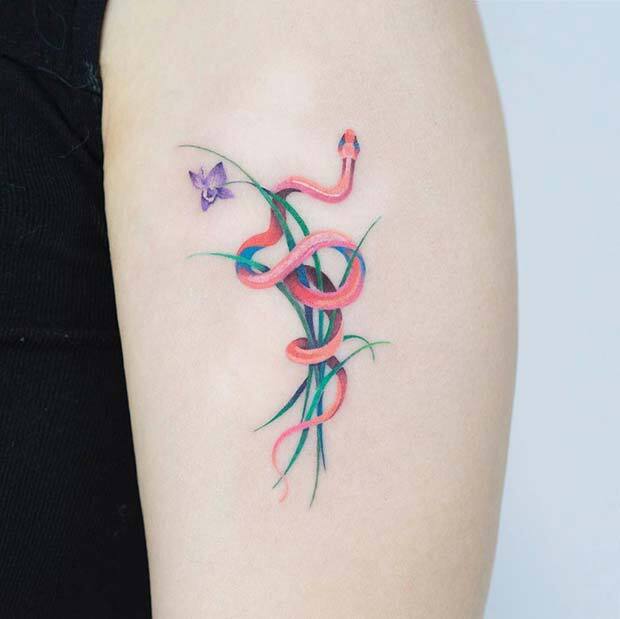 The design features a snake wrapped around plants, with a cute butterfly added in. It’s a chic and elegant tattoo. You can recreate this design or try it in a different light color; purple would look beautiful.