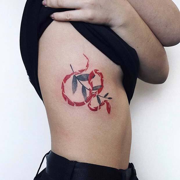 Here’s a tattoo featuring a red snake on the ribs, set against a leafy background. The snake resembles a milk snake due to its red color and stripes. It’s a cool design that will look great on anyone. You can try this red ink snake or draw inspiration from a different type of snake.