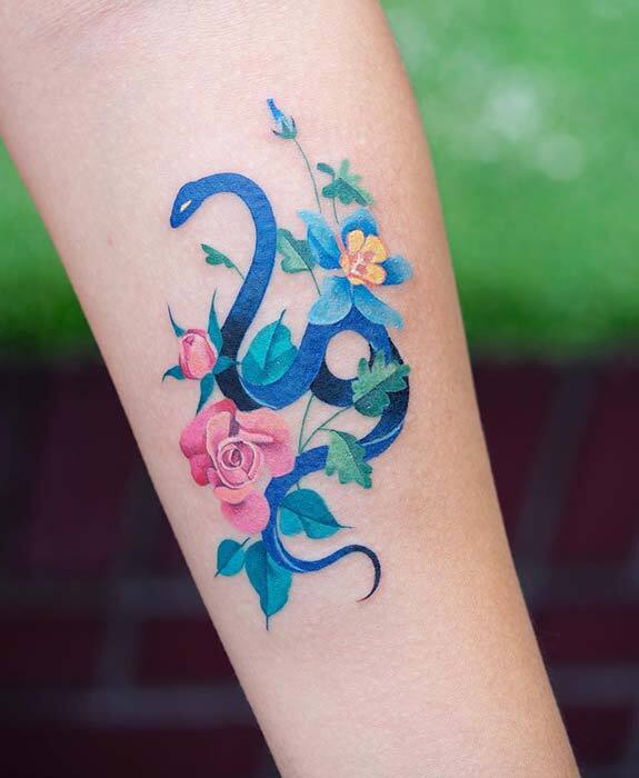 This tattoo features a snake in various shades of blue, surrounded by beautiful flowers. It’s a unique and stunning design. You might opt for a blue snake like this, or consider a similar design with a different colored snake or a variety of flowers.