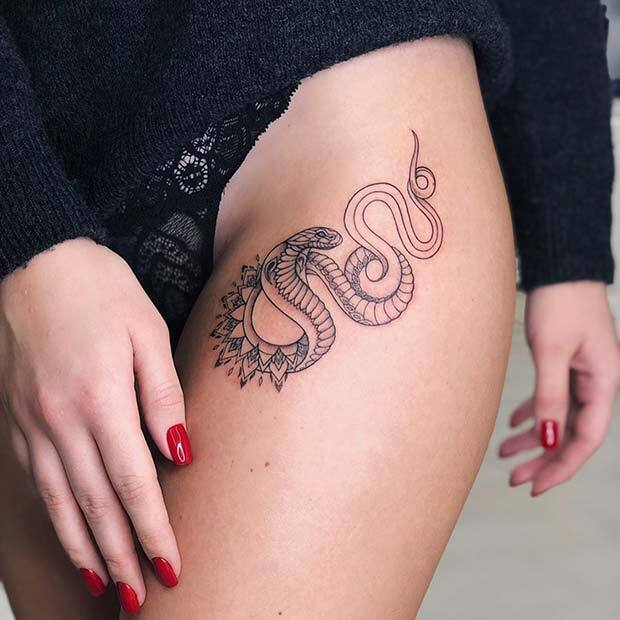 Next, we have a unique design featuring a snake on the thigh. This tattoo has a Cobra-style snake combined with a mandala pattern around it. The fierce and bold snake contrasts beautifully with the mandala, adding a pretty, feminine touch. You can choose any mandala pattern and even incorporate some color for a personalized look.