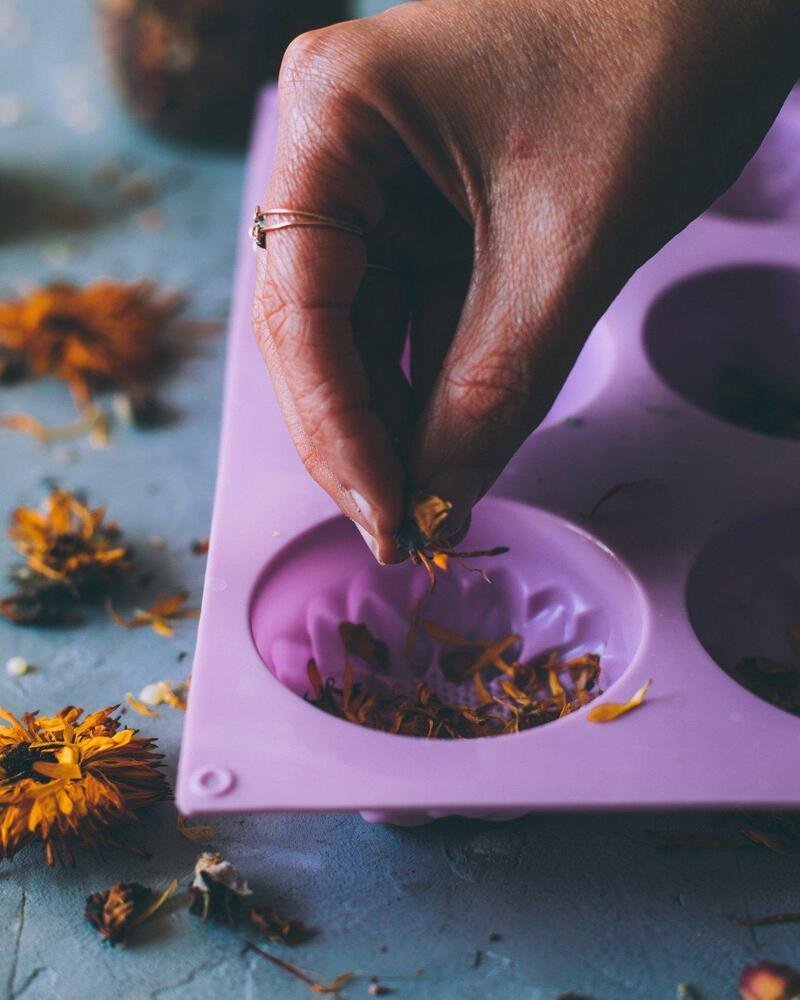 After the infused oil, shea butter, mango butter, and essential oils have blended with the beeswax, pour the mixture into silicone molds. This is where you can really get creative! I love adding dried flowers to the molds for an extra touch of beauty. The lotion bars will take on the shape of the mold, and the dried flowers will make them even more stunning. Make sure to use silicone molds—this ensures the bars will pop out easily once they’re set.