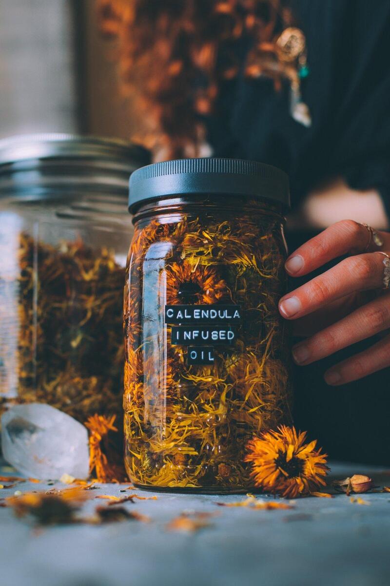 Making your own flower-infused oil is super simple. For this example, I’ll guide you through creating a calendula-infused oil. If you prefer a different flower, simply swap out the calendula for your chosen blooms. Start by placing dried or fresh calendula flowers into a jar, then pour olive oil over the flowers, ensuring they are fully covered. Let the flowers infuse in a dark place for 4-6 weeks, though you can leave them longer if you’d like. A pantry or apothecary works perfectly for this process! Once your infusion is ready, strain out the flowers using a strainer or cheesecloth.