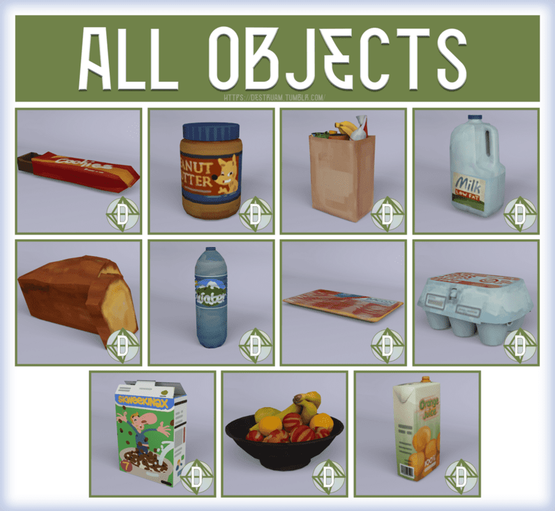 Breathe life into your Sims’ kitchens with Destruam’s Grocery Clutter CC for The Sims 4! This collection by a creative designer offers a delightful assortment of clutter specifically designed to stock your virtual shelves and fridges. Expect to find a wide variety of realistic food items like milk cartons, colorful cereal boxes, and fresh fruit. Destruam’s CC goes beyond basic groceries; you might find condiment bottles, cookbooks propped open, or even leftover takeout containers. These details help create a kitchen that feels real and used, allowing you to tell stories through the clutter and let your Sims’ personalities shine. So, ditch the empty shelves and fill your Sims’ kitchens with the delicious bounty of Destruam’s Grocery Clutter CC!