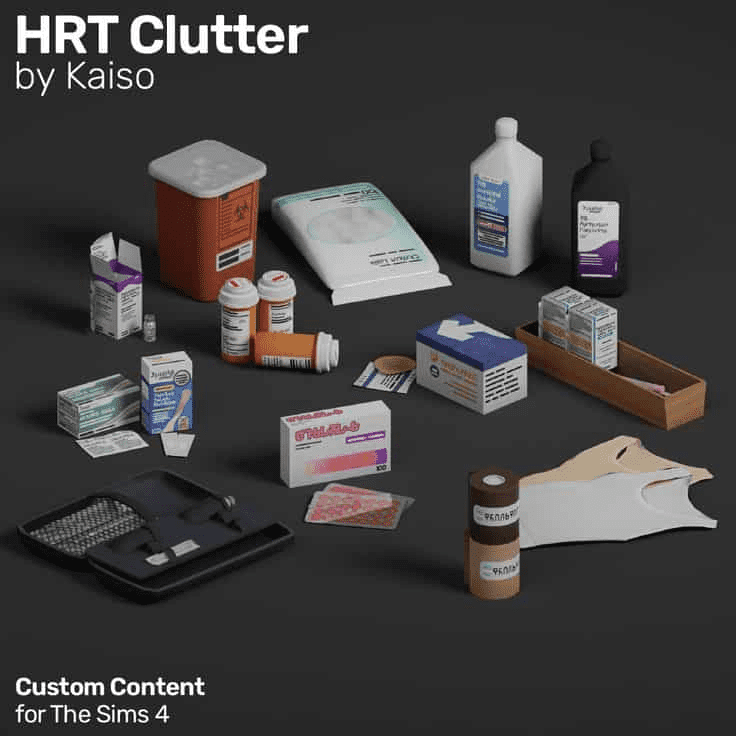 The “HRT” (Hormone Replacement Therapy) clutter custom content (CC) pack for Sims 4 by Kaiso is a thoughtful and inclusive addition designed to represent the experiences of transgender Sims. This CC pack includes a variety of HRT-related items such as medication bottles, hormone patches, syringes, and informational pamphlets, all crafted with careful attention to detail and sensitivity. These items can be placed in bedrooms, bathrooms, or personal spaces, adding a realistic touch to the lives of Sims undergoing hormone therapy. By incorporating such specific and meaningful clutter, Kaiso’s pack provides players with the tools to create more diverse and representative stories within their Sims’ communities. The “HRT” clutter CC pack not only enhances the authenticity of the game but also fosters a greater understanding and visibility of transgender experiences in the virtual world.
