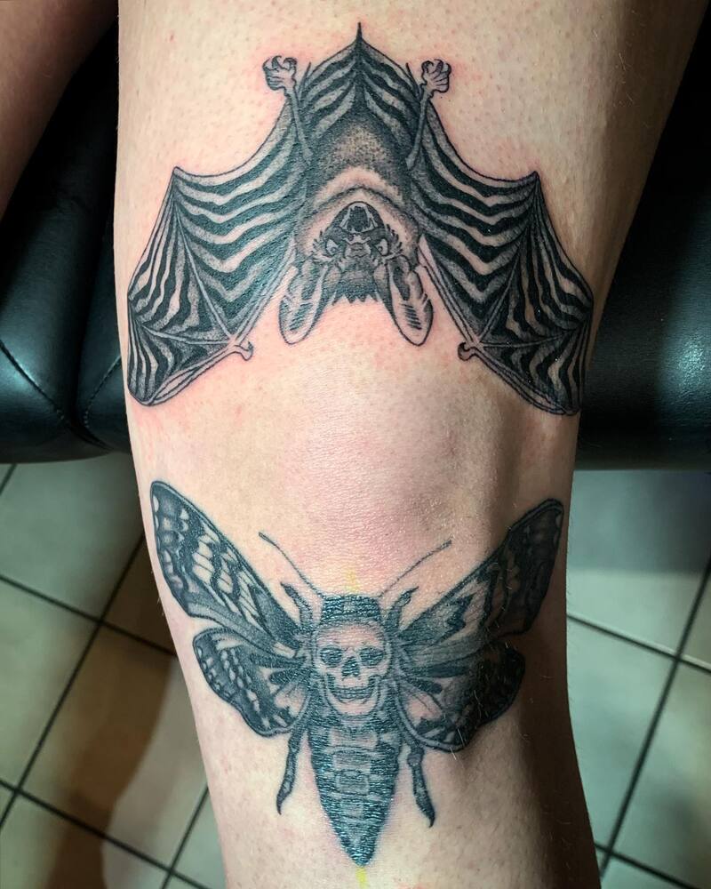 BAT AND MOTH ABOVE KNEE TATTOO: NOCTURNAL CHARM
