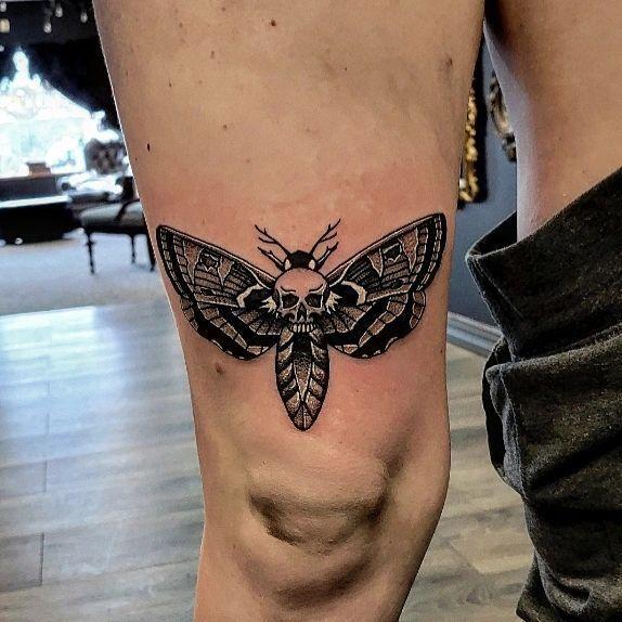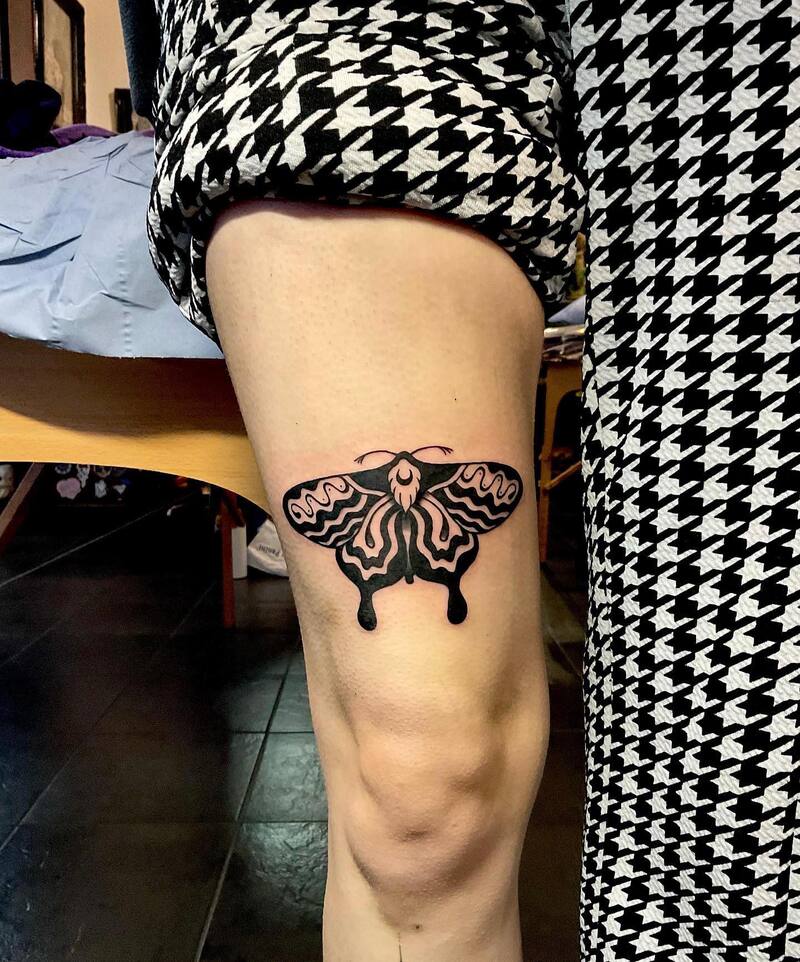 MOTH ABOVE KNEE TATTOO: MYSTERIOUS BEAUTY