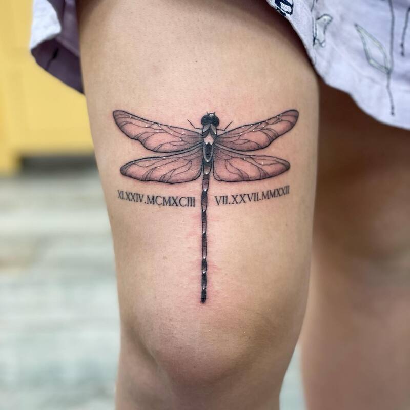 If you’re seeking an above-the-knee tattoo design that symbolizes peace and harmony, consider getting a dragonfly inked in this area. Incorporating Roman numerals alongside the dragonfly can represent an important date that holds a special place in your heart, making it even more meaningful. This combination beautifully captures both the essence of tranquility and a personal memory, creating a unique piece of art that resonates with your journey.