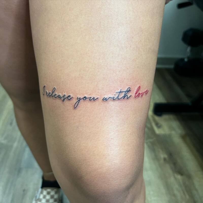 Looking to carry a powerful message of love and liberation? Consider an “I Release You with Love” text tattoo above your knee. This meaningful design serves as a constant reminder to let go of negativity and welcome a life filled with love and positivity. It’s a beautiful and empowering tattoo idea for women, symbolizing emotional freedom and personal growth on your journey toward peace and fulfillment.