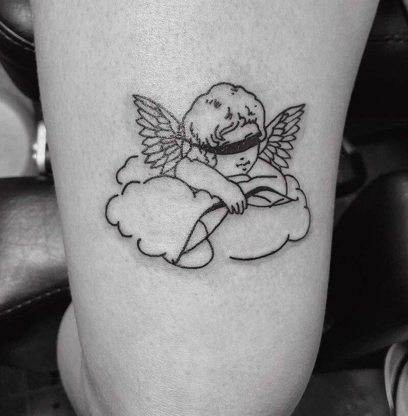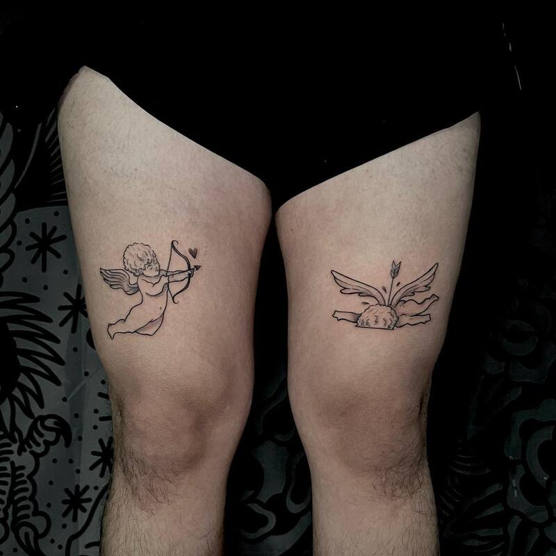 Cupid’s tattoo is a wonderful way to express that you’ve fallen in love while keeping the identity of your beloved a mystery. Often, couples choose to get this tattoo together in different locations, but it’s particularly ideal for above-the-knee placement. This area provides ample space for clear and detailed designs, allowing you to showcase your affection in a unique and artistic way.