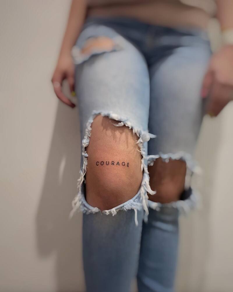 Minimalist tattoos are trending, offering a subtle yet impactful way to express yourself while being easy to show or hide. To serve as a constant reminder of your bravery and ability to overcome life’s challenges, consider getting a fine courage line tattoo above the knee. This design acts as a powerful form of self-affirmation, reinforcing your strength and determination to face struggles and hurdles on your own.
