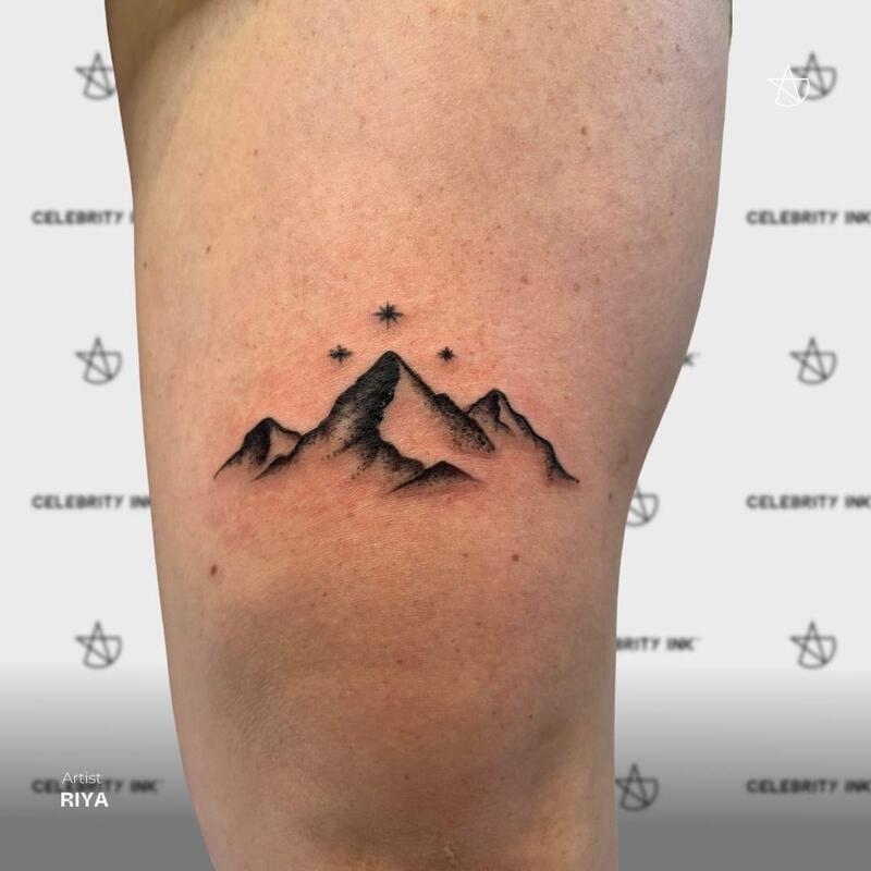 Embrace the serene beauty of nature with a simple and minimalist mountain tattoo above your knee. This design symbolizes strength, adventure, and the aspiration to conquer new heights. With its understated yet impactful aesthetic, a mountain tattoo elevates your style while reminding you of your love for exploration and the natural world.