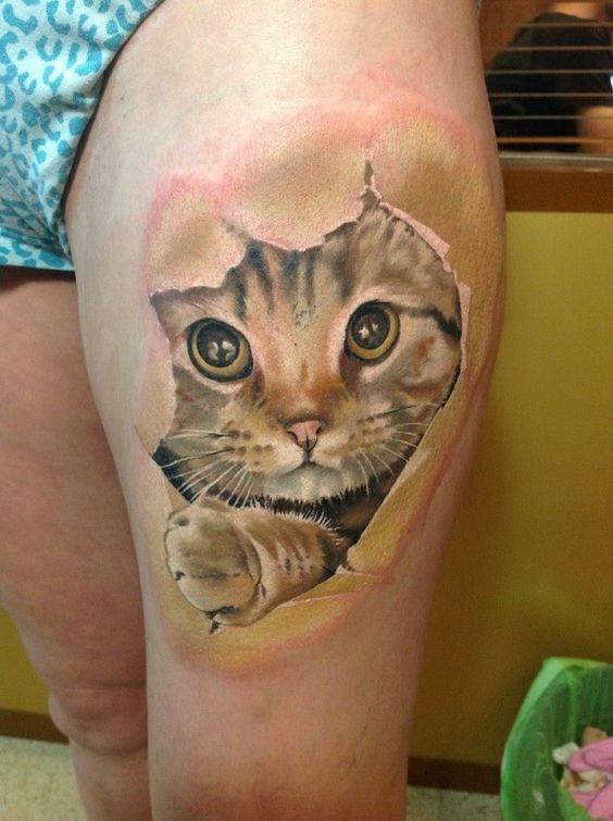 A 3D lovely cat tattoo captures the charm and playfulness of a feline in a design that appears almost lifelike on the skin. The cat’s fur, eyes, and whiskers are rendered with such detail that it seems as if the cat could leap off the surface.