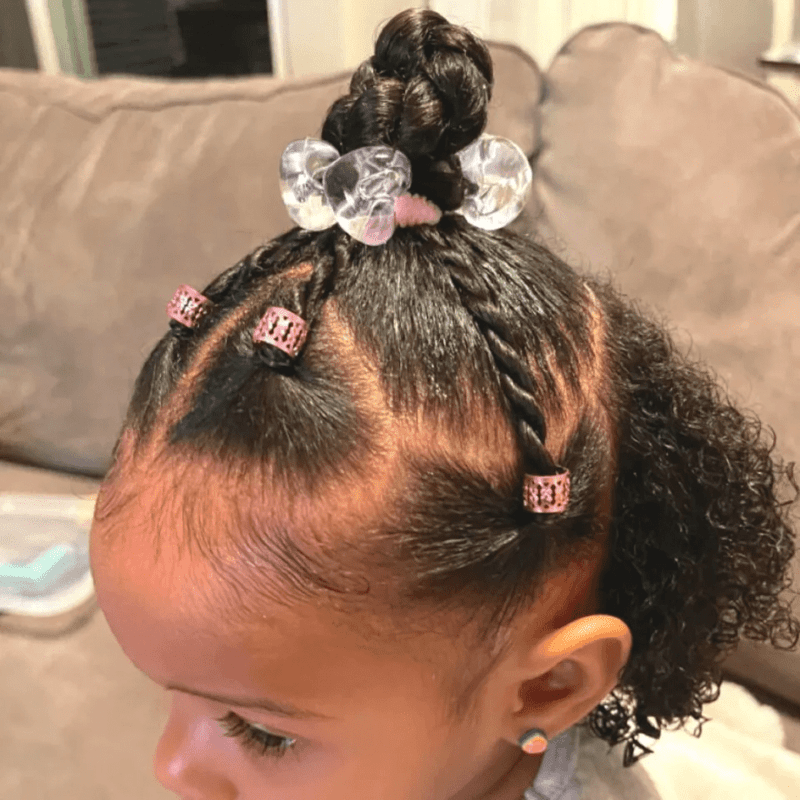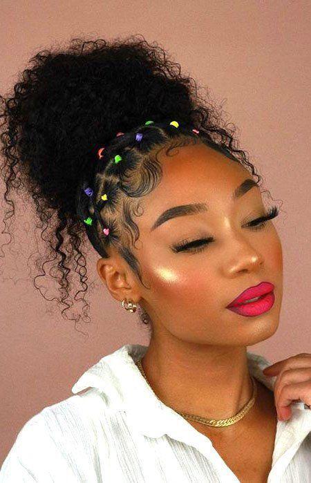 Rubber band hairstyles look just as stunning with a curly natural ponytail as they do with a sleek, straight one. For a fun and playful vibe that can be dressed up for an evening event, try adding metal beads or rings over the rubber bands. For even more style, consider incorporating tribal braids—both in the ponytail itself and as face-framing accents. This adds an extra layer of sophistication while keeping the look bold and unique.