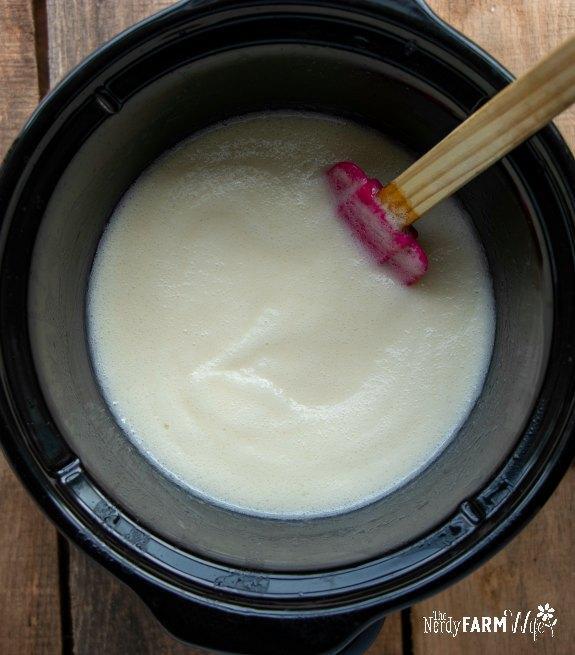 Weigh the oils for your recipe and place them into a slow cooker. Turn the heat to high. If you’re using milk powder, briefly blend it into the combined oils using an immersion blender.