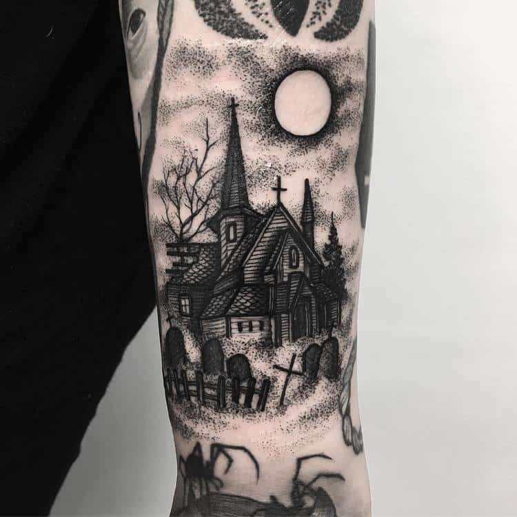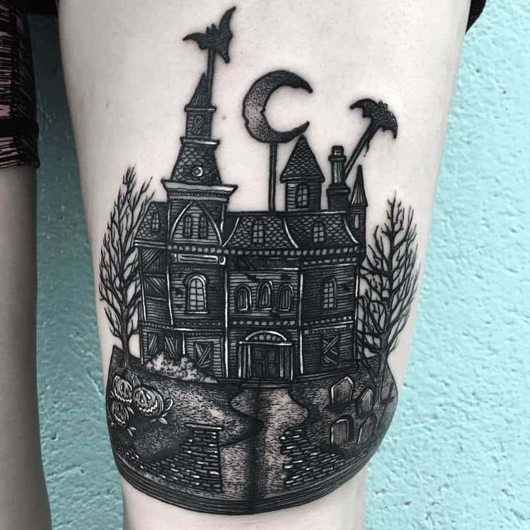 This playful tattoo features ghosts emerging from a bubbling cauldron, creating a vibrant and festive Halloween scene. The adorable ghostly expressions make it a delightful choice for those who prefer a more charming approach to Halloween tattoos.