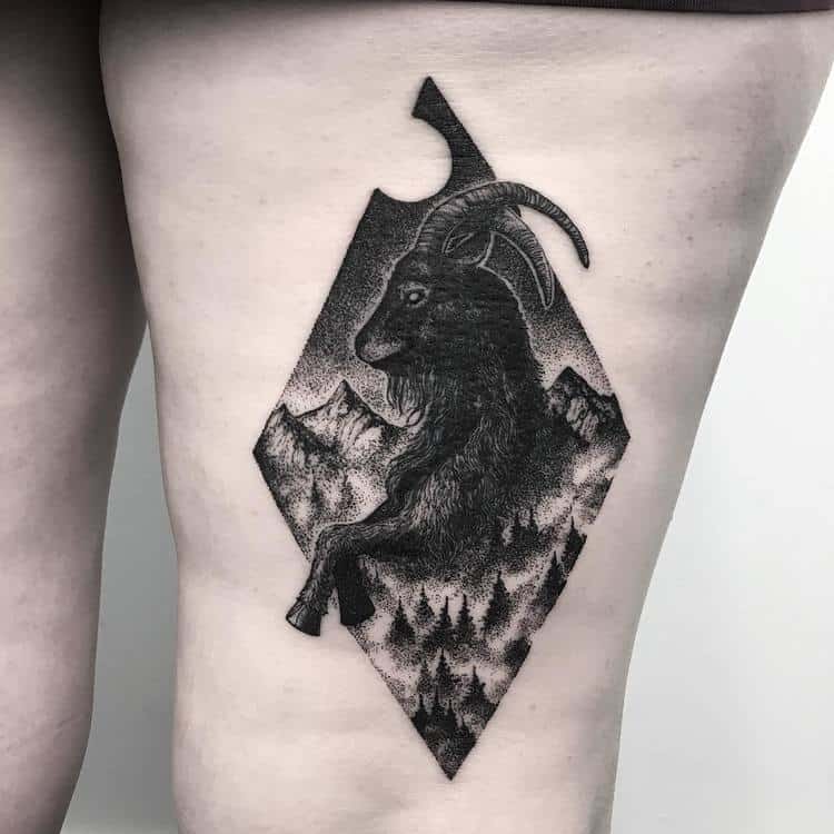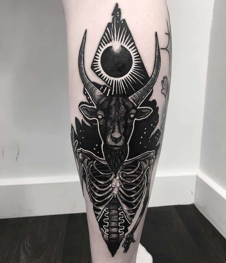 This enchanting tattoo features a captivating cat peeking from a mystical cup. Swirls of magical essence and stars surround the feline, creating a brew of charm. It’s a perfect blend of Halloween’s iconic mascot with a touch of occult magic, ideal for those who adore cats and the supernatural.