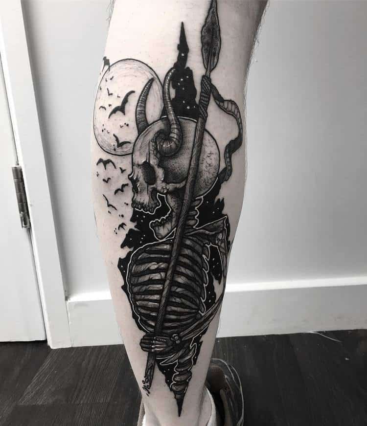 This tattoo features a devilish character, full of sass and rebellion. Holding a banner with the phrase “F*ck y’all,” it’s a playful nod to Halloween’s rule-breaking tradition. Perfect for those who wear their rebellious spirit as a badge of honor.