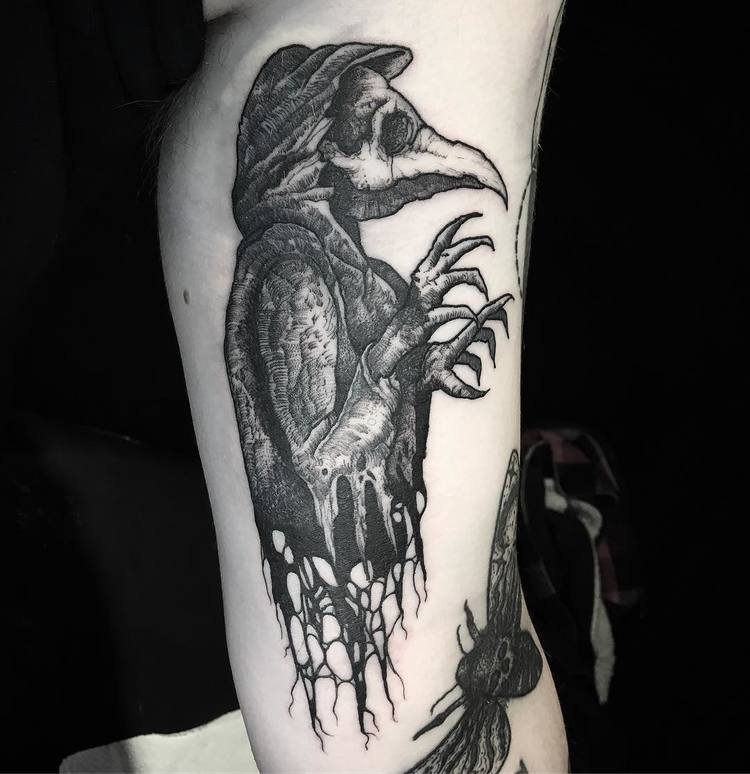 This moth tattoo features a creature with eyes that hold untold secrets, fluttering through the shadowy realm of Halloween night. The intricate wings and haunting gaze make it a captivating choice for anyone drawn to the enigmatic and slightly eerie side of the natural world.