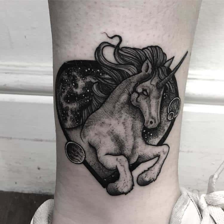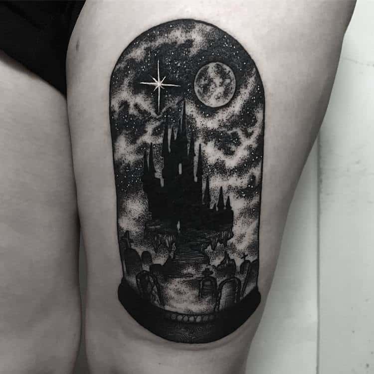 This adorable tattoo puts a cute spin on the quintessential Halloween symbol: the black cat. The feline is depicted wearing a ghostly costume and gazing up at the night sky, where a crescent moon and stars twinkle. It’s the perfect choice for women who love cats and appreciate the playful side of Halloween.