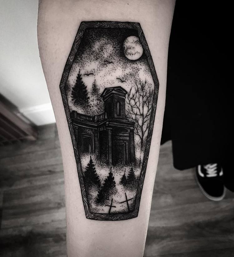 This vibrant tattoo features a coffin with adorable eyes, surrounded by colorful flowers and friendly bats. The playful lettering adds a touch of humor, making it a perfect choice for a cute Halloween tattoo with a dash of dark humor.