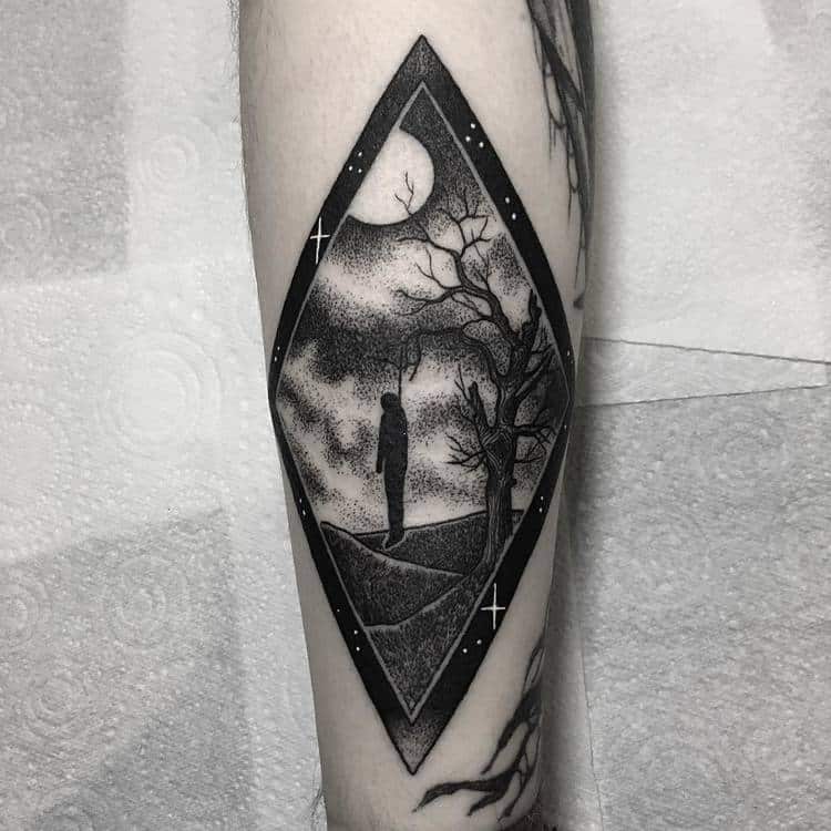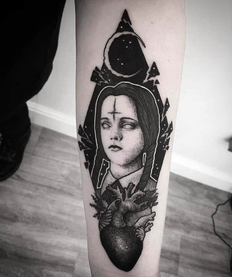 This tattoo captures the essence of emo culture with the phrase “I’m Not Okay” framed by dripping hearts, bats, and more. It’s a nod to the angst we all feel sometimes and a perfect blend of Halloween elements and emo style. This design is ideal for those who love both the holiday and the music genre.