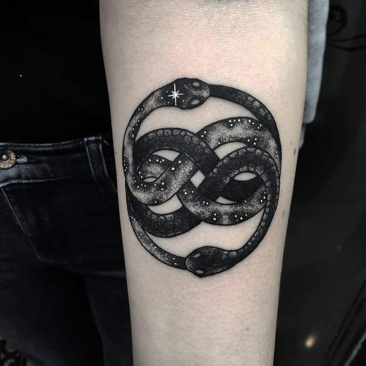 This tattoo evokes the quiet dusk with three bats gracefully soaring through the sky. Delicate lines highlight the intricate details of their wings, while tiny stars create the impression of an early evening sky. It’s a subtle and cute Halloween tattoo idea for those who prefer a minimalist design.