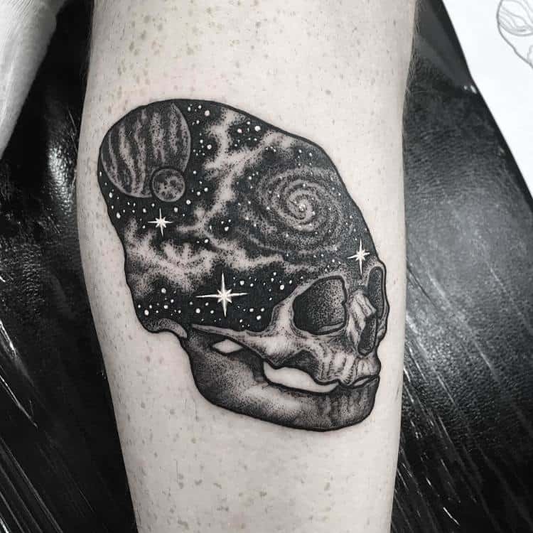 This enchanting tattoo elevates the Halloween theme to cosmic heights. A witch’s hat and wand, adorned with stars, evoke the magic of a clear October night sky. The soft pink accents and whimsical design make it a dreamy choice for those who prefer a more enchanting Halloween experience.