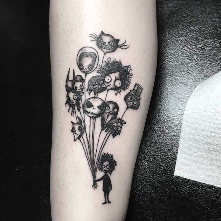 For fans of the macabre and romantic, this tattoo inspired by The Nightmare Before Christmas is a perfect choice. The iconic couple is reimagined in a tarot card design, labeled “The Lovers,” merging the world of Halloween fantasy with the allure of vintage flash art.