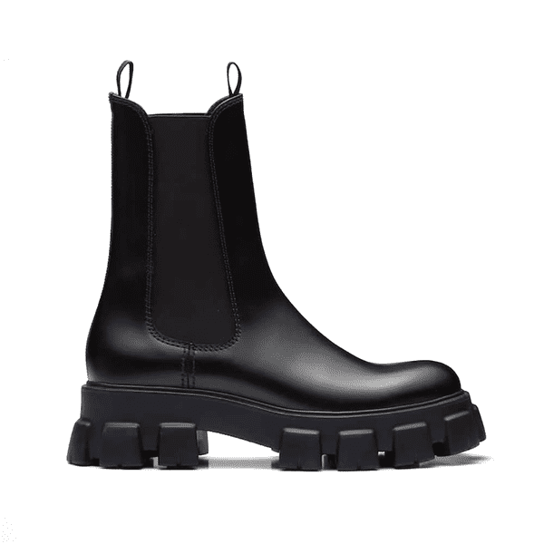 Unlike traditional Chelseas, the Monolith version ditches the laces and features elasticated side gussets for a comfortable, pull-on fit. The gussets often retain the signature Prada triangle logo for a touch of brand recognition. Overall, the Prada Monolith Platform Chelsea Boot is a statement piece that elevates any outfit, from jeans and a t-shirt for a dressed-down look to a skirt or dress for a more formal occasion. Expect a high price point due to the designer label and premium materials.