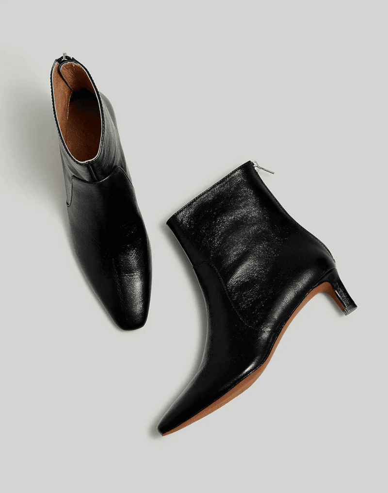 Madewell’s The Dimes Kitten-Heel Boot is a chic and versatile option for fall and winter wear. It features a sleek silhouette with a straight shaft that likely hits at the ankle or just above. The key detail is the kitten heel, which is typically under 3 inches tall. This provides a touch of lift and elongates the leg without sacrificing comfort, making them ideal for all-day wear.
