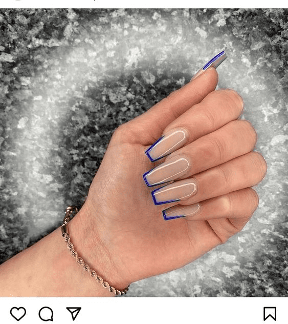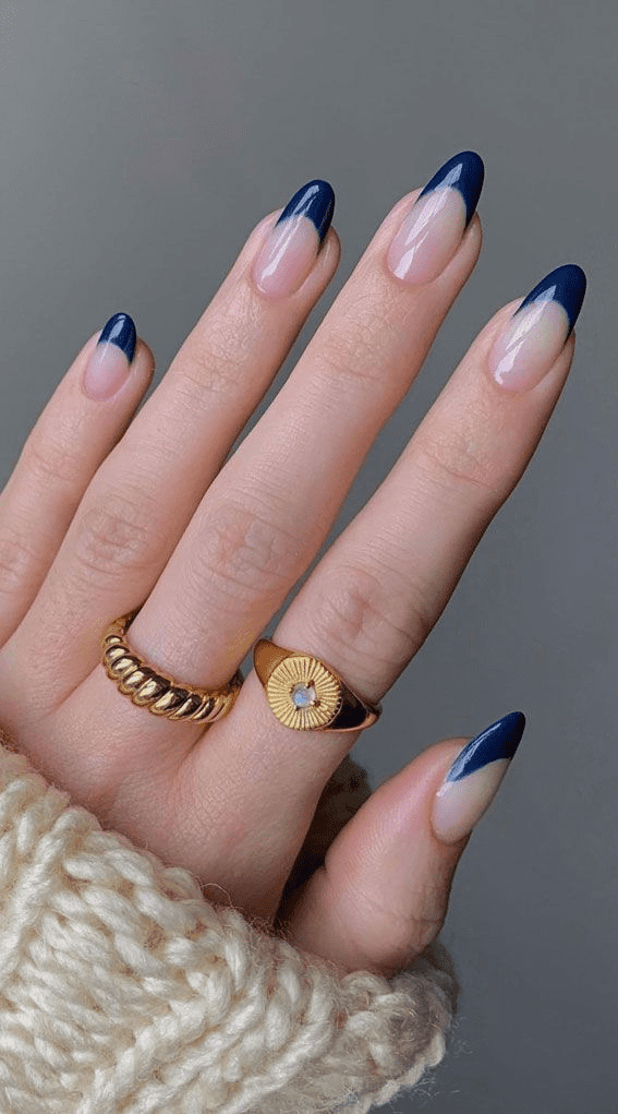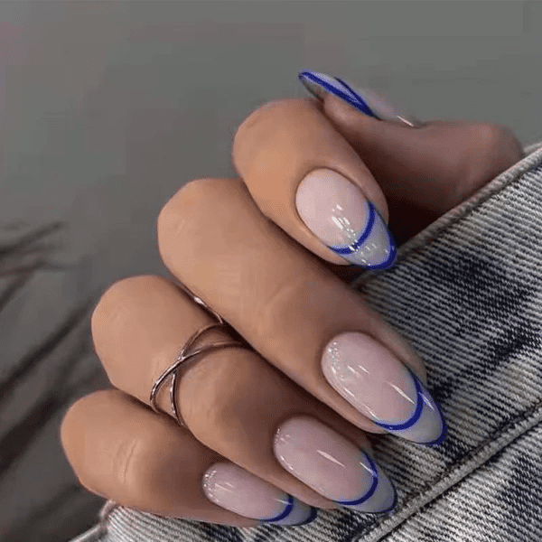 The thin navy blue French manicure is the epitome of understated elegance. It takes the classic French design and injects a dose of sophisticated cool with a crisp line of navy blue at the tips. This subtle pop of color adds a touch of personality without overwhelming the look. The thinness of the line keeps the manicure clean and versatile, making it perfect for any occasion. Whether you’re dressing for work, a night out, or a casual weekend brunch, the thin navy blue French manicure adds a touch of polish that complements any outfit. Plus, the thin line is flattering on all nail shapes and lengths, making it a universally appealing choice.