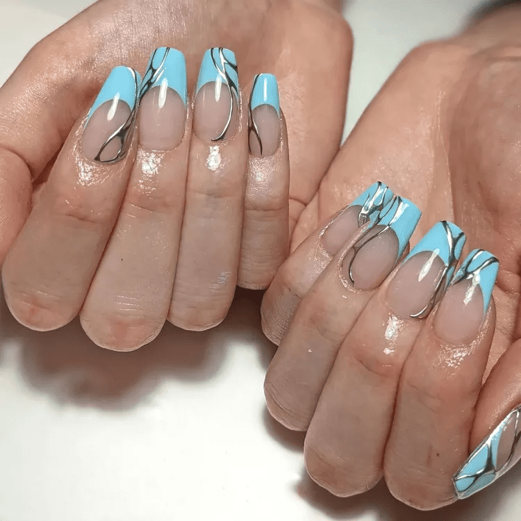 Channel a futuristic and eye-catching vibe with blue chrome French tips. This trendsetting design takes the classic French manicure and elevates it to a whole new level of cool. The tips themselves become a mesmerizing spectacle, painted with a chrome polish that shifts and reflects light in various shades of blue. The effect is almost holographic, creating a captivating play of color on your fingertips. Blue chrome French tips are perfect for those who want to make a statement and embrace a fashion-forward look. They’re guaranteed to turn heads and add a touch of undeniable wow factor to your nails.