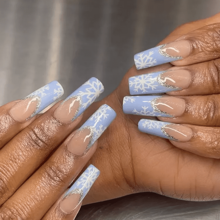 For a touch of wintery elegance that transcends the season, frosted French tips offer a cool and sophisticated twist on the classic manicure. The tips come alive with a delicate dusting of frosted white, mimicking the soft sheen of freshly fallen snow. This design offers a beautiful play of light and texture, adding a touch of ethereal beauty to your fingertips. Frosted French tips are perfect for those who love a natural yet glamorous look and can be easily adapted to any season.