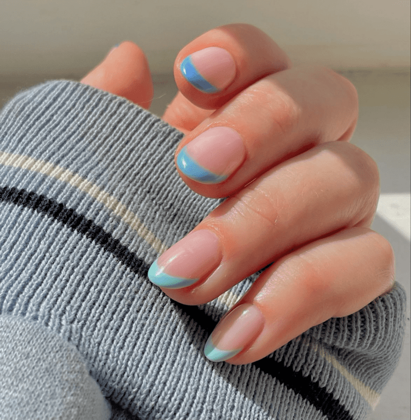 Bring a nautical feel with a touch of luxury by using a French bow design in navy and lighter blue. This playful combination brings a fresh take on a classic manicure while still maintaining sophistication. The tips then come to life with a fun interaction of colors. Paint a sharp line of navy blue near the edge of the nail, creating a defined border. Add a thinner line of a lighter blue color — think baby blue, sky blue, or even a touch of teal — right next to the navy blue line. This creates a beautiful layered effect that is both modern and elegant. Navy blue and lighter blue French tips are perfect for summer or anytime you want to add beachy charm to your fingertips. If you are wondering what short nail style to create for the summer, consider this one!